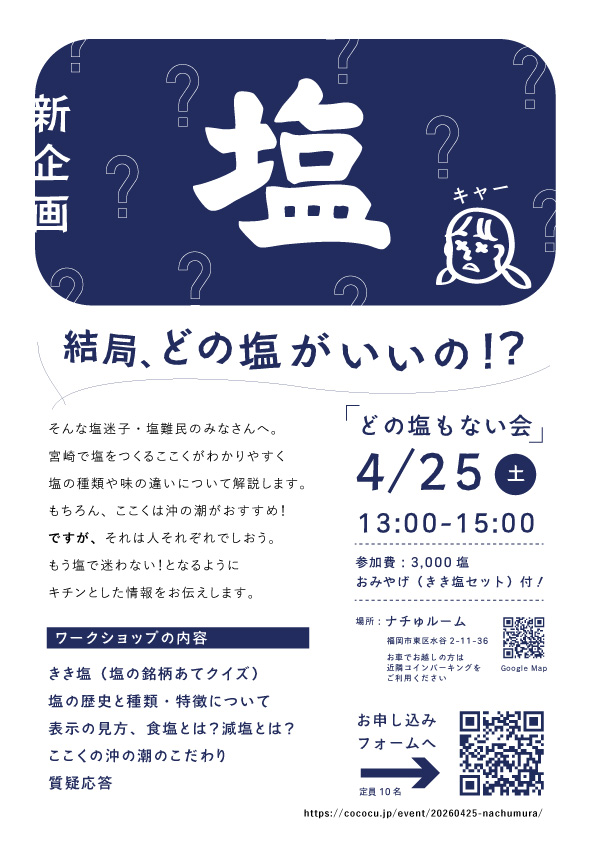 そんな塩迷子・塩難民のみなさんへ。 宮崎で塩をつくるここくがわかりやすく、塩の種類や味の違いについて解説します。 もちろん、ここくは沖の潮がおすすめ!・・・ですが、それは人それぞれでしおう。もう塩で迷わない!となるようにキチンとした情報をお伝えします。
